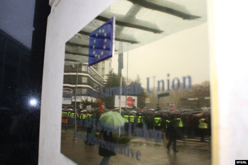 Во одразот на таблата на Европската комисија во Скопје се гледаат демонстрантите што протестираат против промена на името